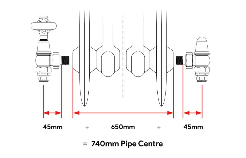If you’re using a Kenilworth Thermostatic Valve Set (which measures 45mm from thread to centre) on a 10-section Traditional Victorian radiator measuring 650mm wide, the approximate pipe centre width would be: