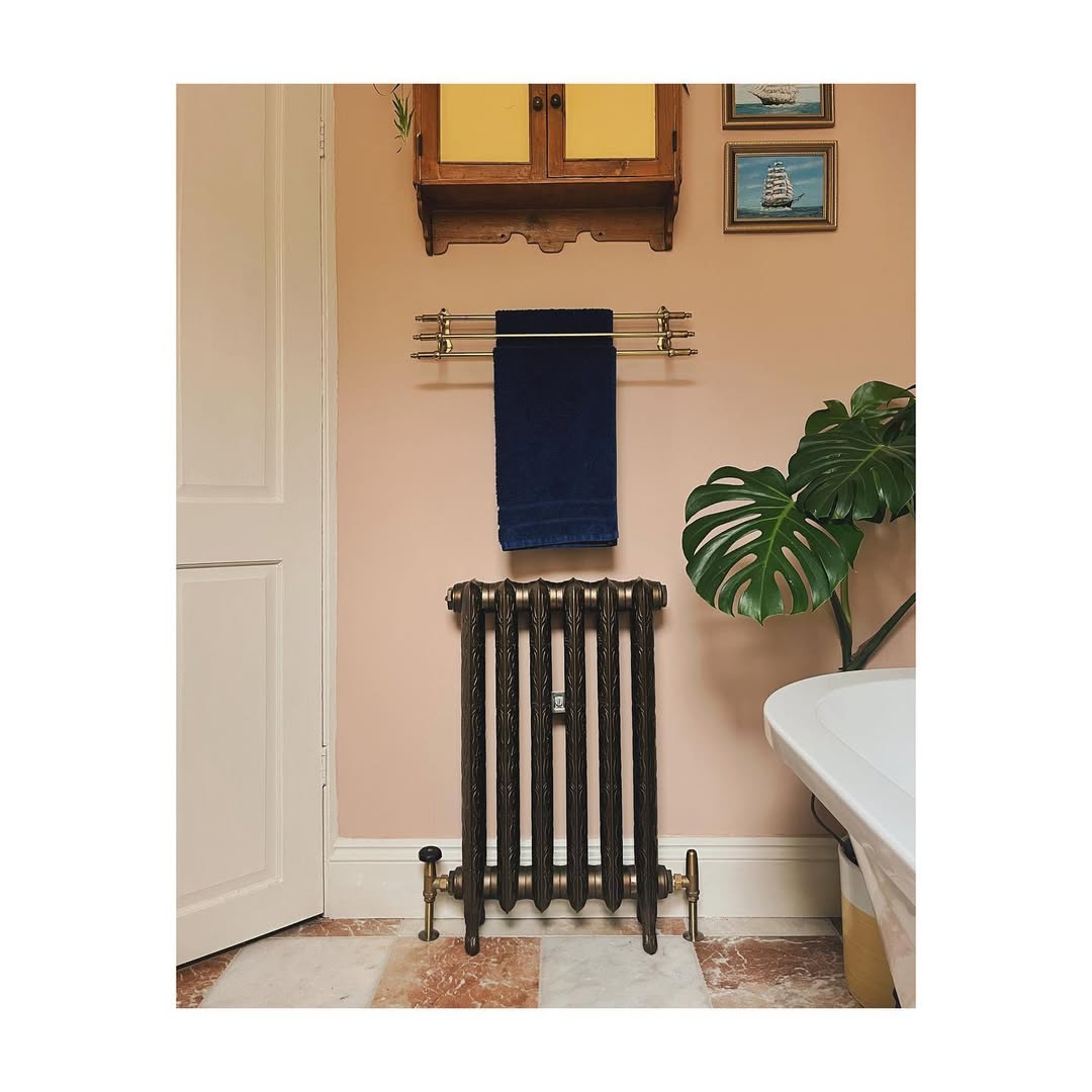 Next up we have this stylish bathroom scene from Leytonstone House And Garden. We love the use of colour and vintage touches to create a calming and serene space. This is our Art Nouveau radiator in antique bronze, which is a warm-toned metal that pairs perfectly with the soft peach tones of the wall and the marble flooring.