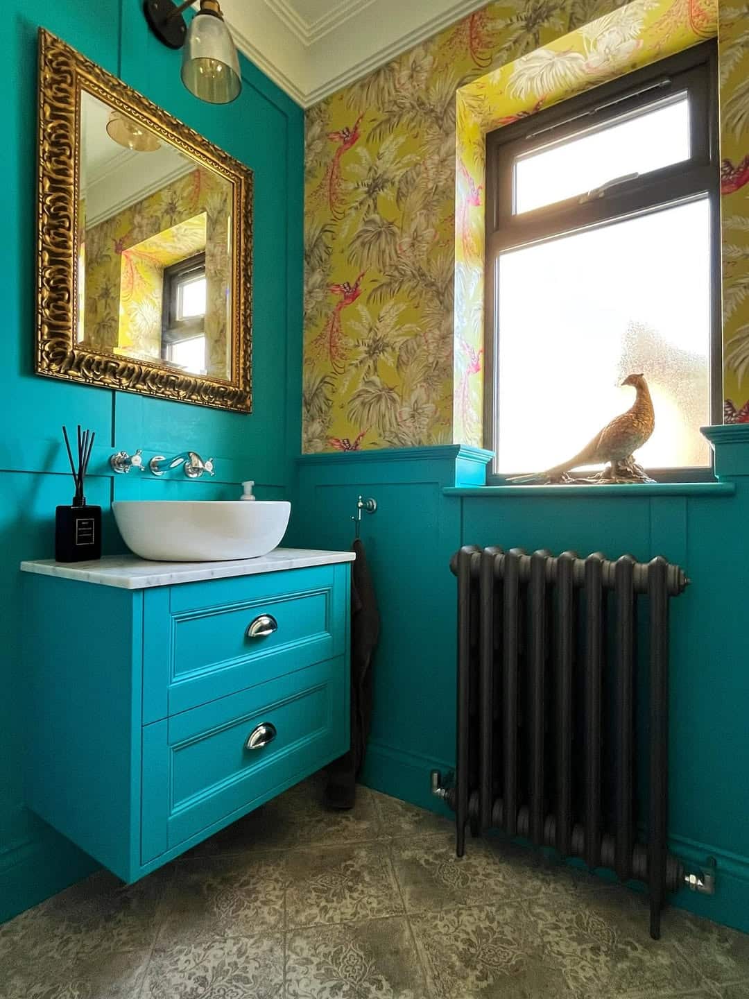 Come for the bright splash of teal, stay for the peacock. This bold and bright bathroom belongs to Audrey, aka Maison Aston. We love the confident use of colour, from the bright teal paint to the elegant wallpaper. And who can resist an ornate mirror? Get this look with the slimline traditional 3 column radiator, which is perfect for smaller spaces like the bathroom.